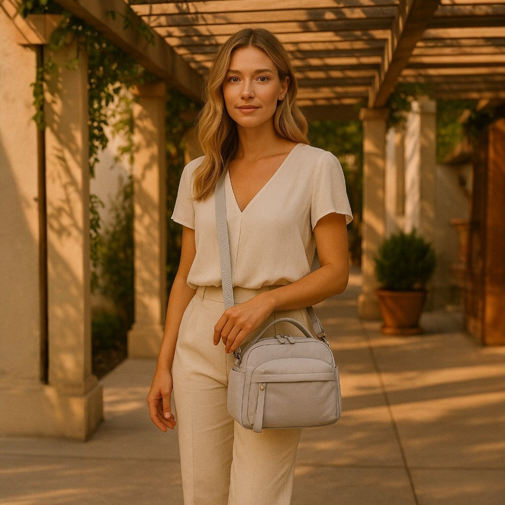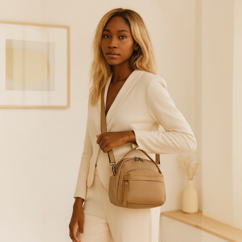 Cu linii moi și formă rotunjită, Lyona adaugă o notă șic fiecărei ținute. Ușoară, moale la atingere și rezistentă la apă, păstrează esențialele tale organizate..